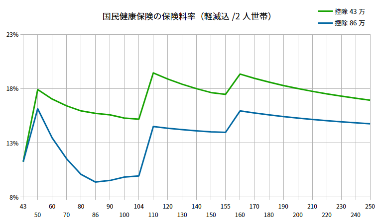 所得割は基礎控除を適用してから算出するため、早見表とグラフからわかるように各々の基礎控除をどれだけ適用できるかで保険料率が異なってきます。